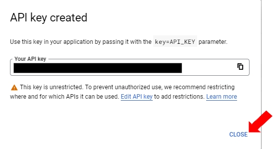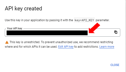 The API key created dialog box displays your newly created key. Copy the key and enter it in the Google Drive connector in Langstack.