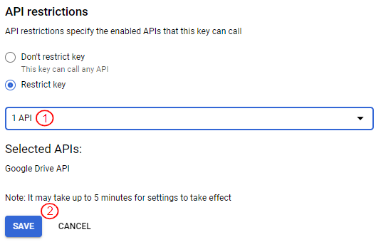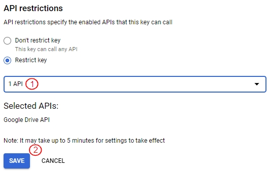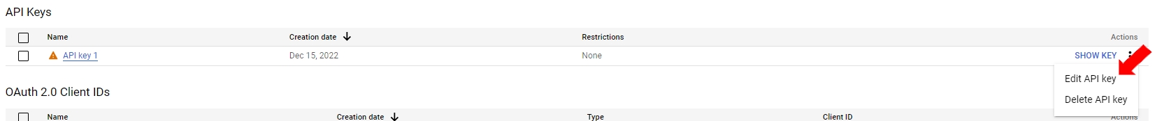 To restrict the key to use only with the Google Drive API, click the edit icon displayed under actions of the listed API key.