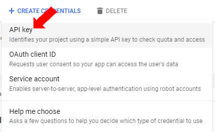 In the selected project, click [+ Create Credentials], then select API key from the drop down menu.