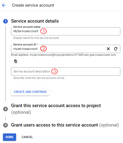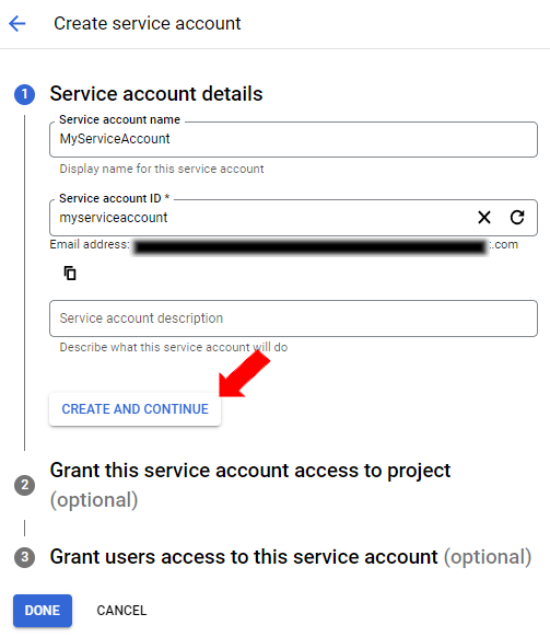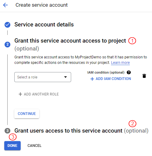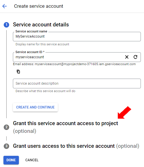 Users can also optionally set up the “Grant this service account access to the project” and “Grant users access to this service account”.