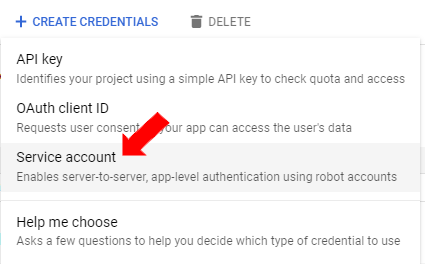 Click [+ Create Credentials], then select Service Account from the drop down menu.