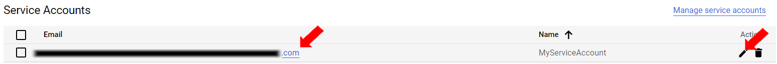 In the created Project>Credentials section, click the email address or edit icon to generate a key for this service account.