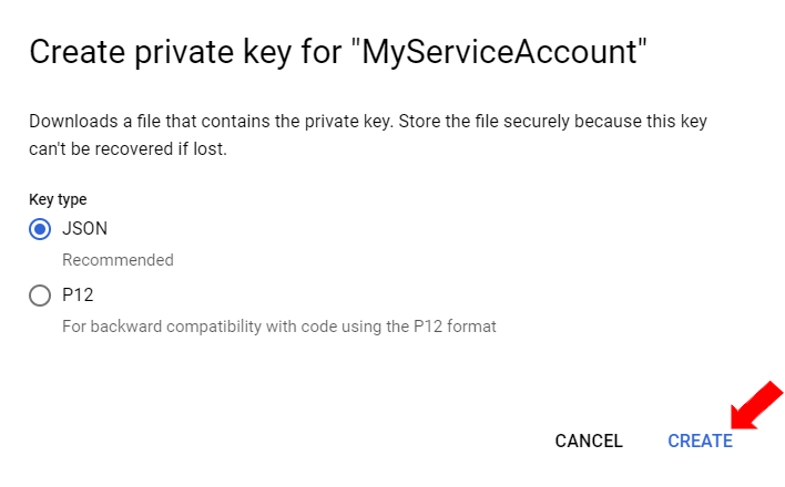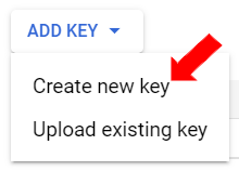 After creating a Service Account, create a Service Account Key as follows: