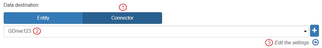 2. For this example, “GDrive123” is selected from the drop-down menu. The connector can be added by selecting a connector from the drop-down menu or a new connector can be created by clicking the \[+] button.&#x20;