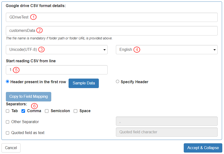* To add details necessary to write the records, the settings in this section “Google drive CSV format details:” are defined as follows:&#x20;