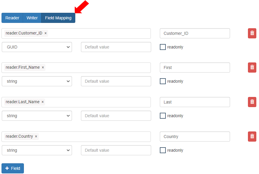 * To align the source fields with destination fields, the settings for the reader and writer format are defined in the “Data Format” tab. The “Reader” tab is selected by default.\