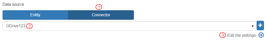 For this example, “GDrive123” is selected from the drop-down menu. The connector can be added by selecting a connector from the drop-down menu or a new connector can be created by clicking the [+] button.