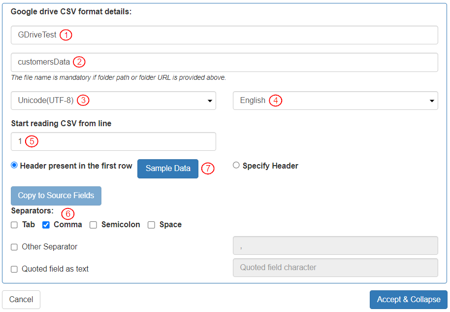 To add details necessary to read the records, the settings in this section “Google drive CSV format details:” are defined as follows: