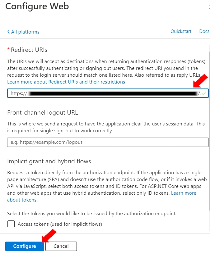 Under “Configure Web”, paste the copied Redirect URI in the field and click [Configure] to save it.