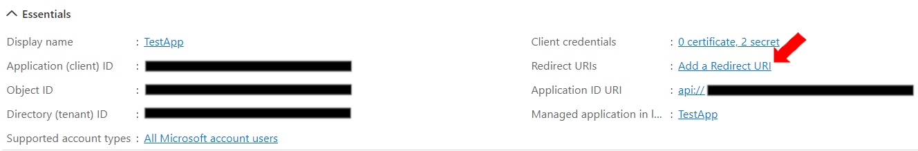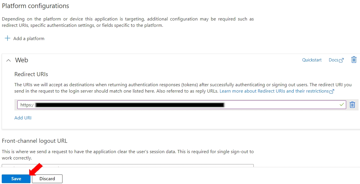 In Microsoft Azure Account, click on “Add a Redirect URI”.