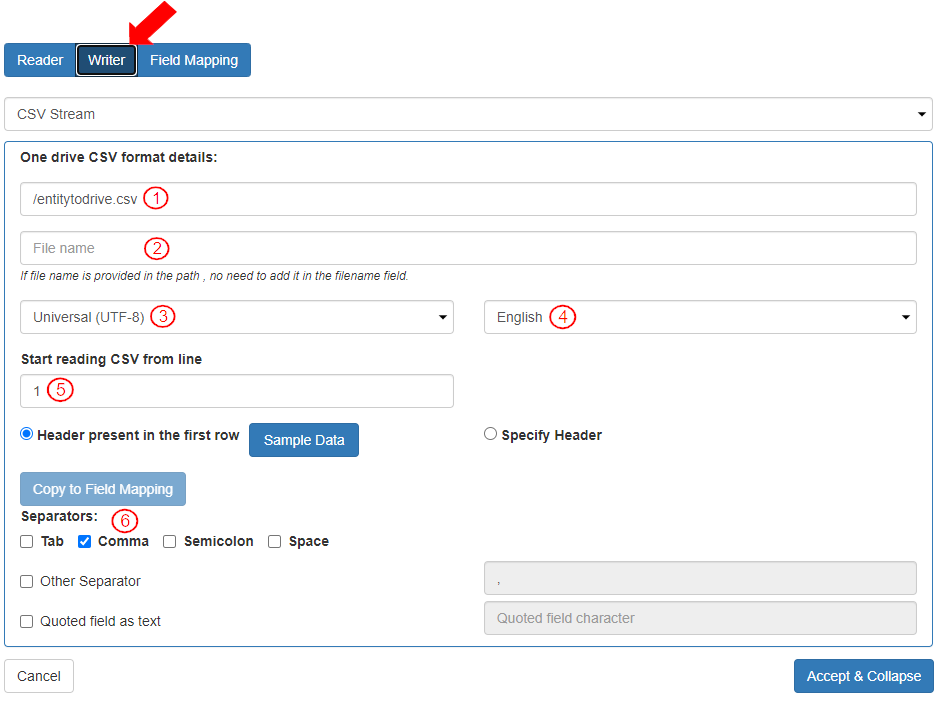 To add details necessary to write the records, the settings in this section “OneDrive CSV format details:” are defined as follows:
