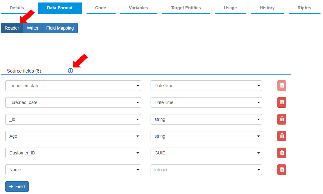 To align the source fields with destination fields, the settings for the reader and writer format are defined in the “Data Format” tab. The “Reader” tab is selected by default. For this example, the fields are added as per the image below.